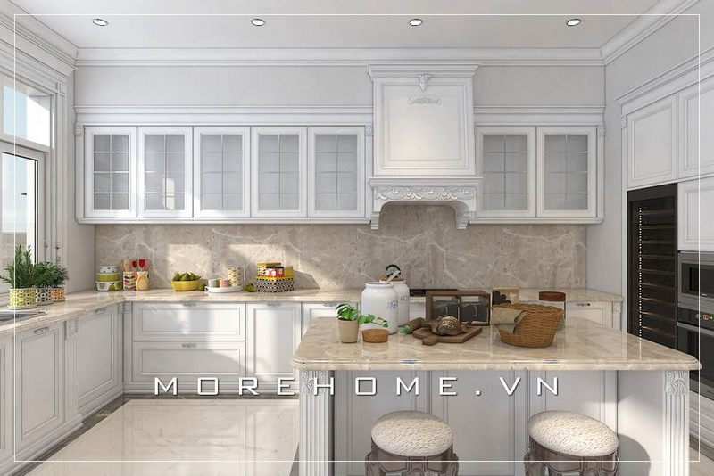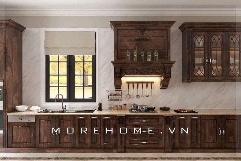 Mẫu tủ bếp chữ L gỗ tự nhiên cao cấp, đường nét tân cổ điển tạo cảm giác sang trong kết hợp thiết bị phòng bếp hiện đại tạo nên không gian nấu nướng tiện nghi cho người nội trợ