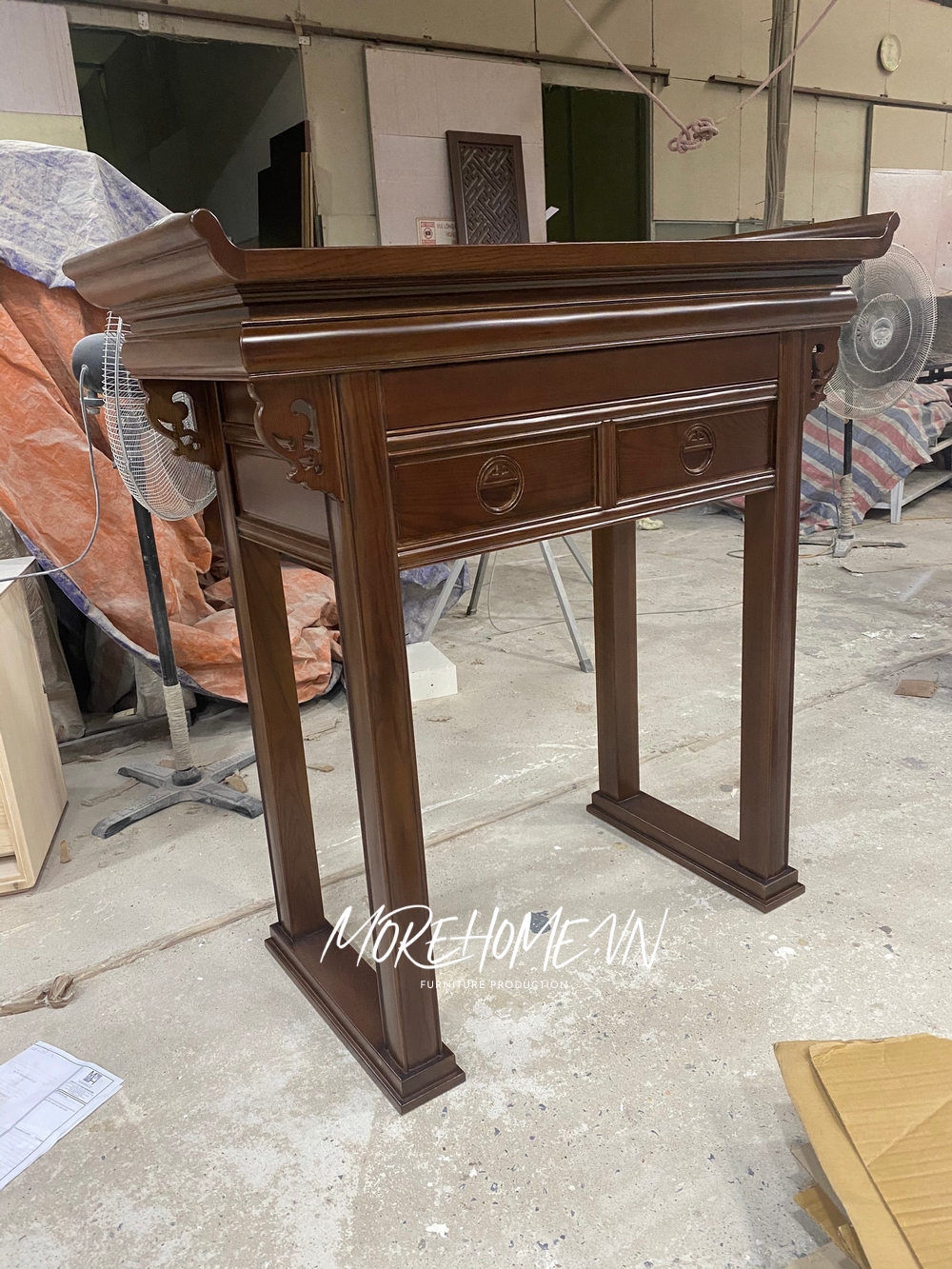 Mẫu bàn thờ gỗ tự nhiên được sản xuất tại Morehome các thợ lâu năm có kính nghiệm dựa vào 2 yếu tố truyền thống và phong thủy thể hiện sự biết ơn, thành kính sâu sắc tới thế hệ đi trước