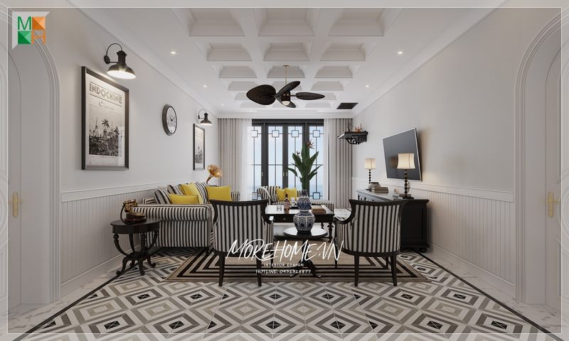 Tạo nên sự ấn tượng cho không gian phòng khách bằng cách thiết kế phong cách Indochine với tông màu đen - trắng chủ đạo và điểm nhấn là gối ôm màu vàng.