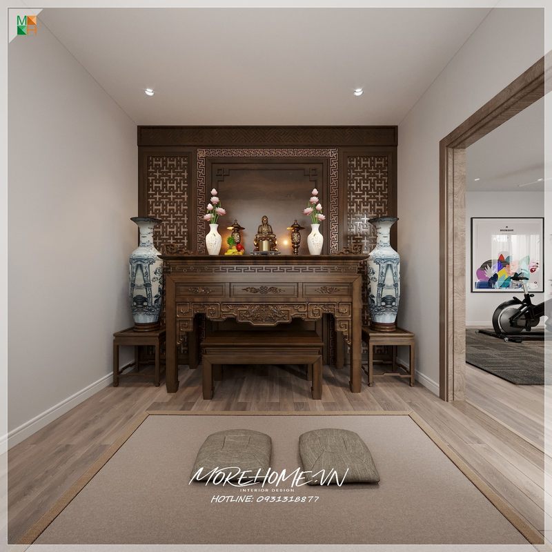 Trang trí nội thất phòng thờ đẹp, trang trọng hợp phong thủy từ nội thất gỗ óc chó cao cấp.