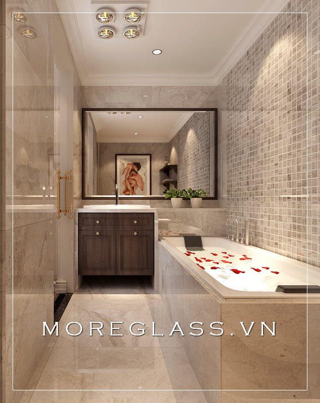 Mẫu thiết kế phòng tắm cao cấp, sang trọng với nội thất, thiết bị vệ sinh hiện đại và tông màu gạch ốp be sáng làm nên một cảnh quan hấp dẫn để cuốn hút mọi ánh nhìn.