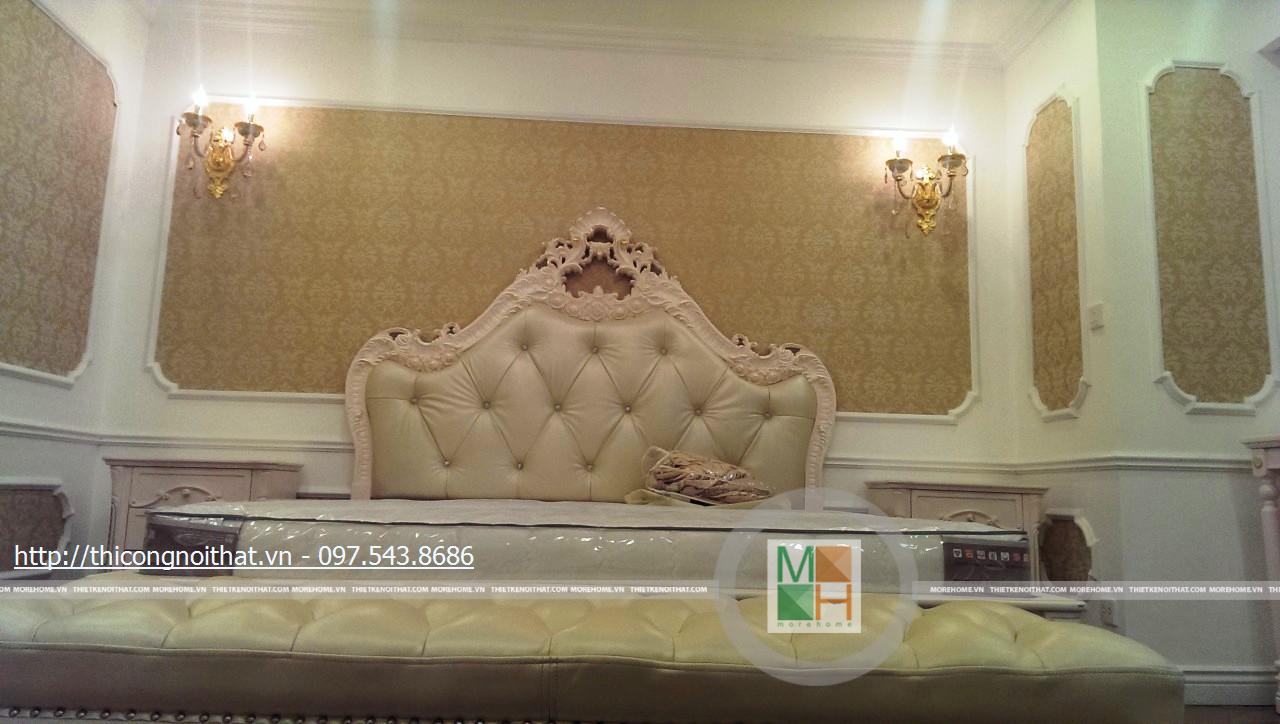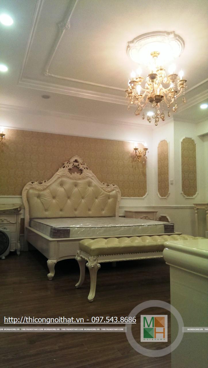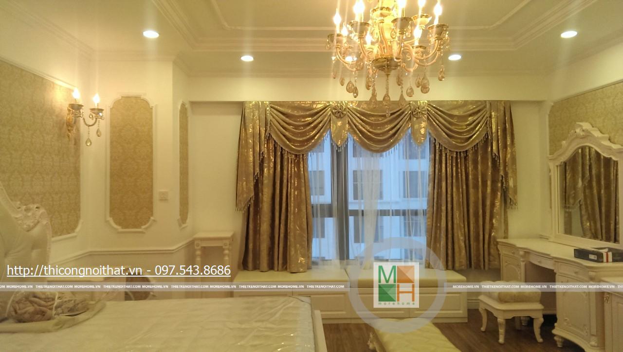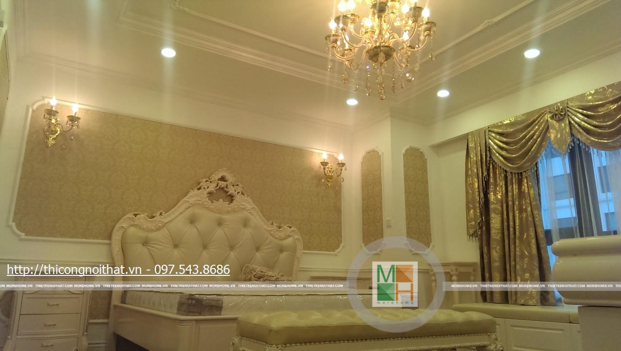 Thiết kế nội thất tân cổ điển trong phòng ngủ cũng có nét tương đồng như phòng khách. Trần nhà với những khung tường vàng đủ hình dạng, kích thước dọc ngang cùng tấm rèm màu vàng càng khiến phòng ngủ thêm ấm áp, lãng mạn. Trong phòng ngủ 2 vợ chồng, chiếc bàn trang điểm gắn liền gương soi được thiết kế rất đẹp mắt khi có những đường cong uốn lượn tinh xảo. Liền đó là kệ tủ đặt ti vi được thiết kế khá đơn giản nhẹ nhàng nhưng vẫn bắt mắt và đặc biệt là có đầy đủ chức năng lưu giữ đồ đạc cần thiết.