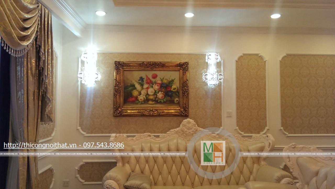 Màu vàng nhạt là tông màu chủ đạo trong phòng khách với bộ sofa có những nét chạm khắc tỉ mỉ tạo đường cong uốn lượn và họa tiết cực kì bắt mắt. Liền ngay bộ sofa là khu vực phòng ăn với bộ bàn ghế ăn mang phong cách cổ điển nhẹ nhàng, thanh lịch, vừa đẹp vừa sang. Rèm che cửa màu vàng càng tôn lên vẻ đẹp sang chảnh cho phòng khách, khiến không gian này thực sự ấn tượng. Một bức tranh treo tường khung vàng được đặt trong không gian này càng tạo thêm điểm nhấn đặc biệt. Chiếc đèn chùm cũng khá ấn tượng khi được thiết kế thành đèn vòng tròn to chứ không phải là hệ thống đèn nhỏ quy tụ như 1 số phòng khách khác.