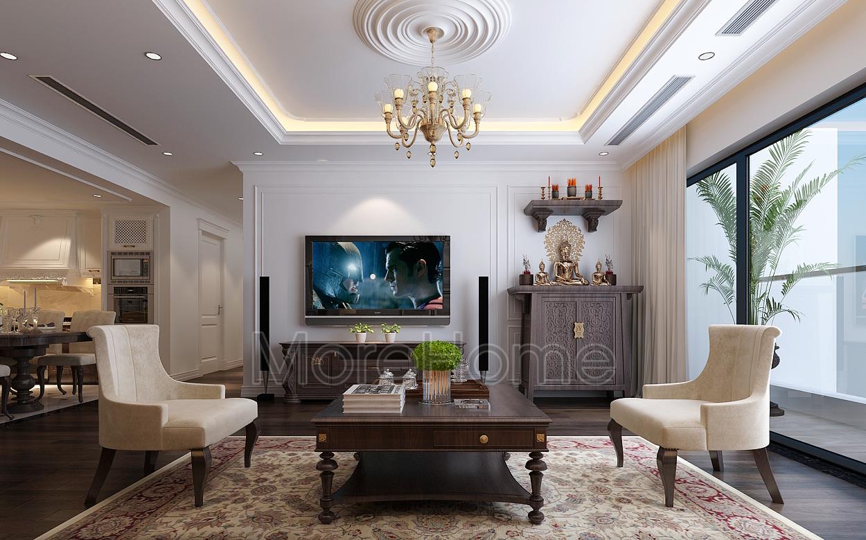 Với phong cách tân cổ điển chung cư Goldmark City chọn bước đệm cho nghệ thuật trang trí là tông màu nền trắng chủ đạo kết hợp với nội thất gỗ tự nhiên cao cấp. Khi bước chân vào căn hộ bạn sẽ thấy ấn tượng ngay với nội thất sang trọng của phòng khách. Nét tân cổ điển nhẹ nhàng của bộ sofa lèm theo những đường nét hoa văn đơn giản của phào chỉ chân tường và phào chỉ ốp trần. Đôi khi chính sự đơn giản lại có sức hút mạnh hơn, ấn tượng hơn. Đèn chùm cổ điển màu vàng đồng được treo chính giữa phòng khách, điểm nhấn cho không gian tầng cao. Trần thạch cao cũng được thiết kế khá ấn tượng vuông khối với đèn âm trần và mâm đèn chùm xoáy tròn liền mạch