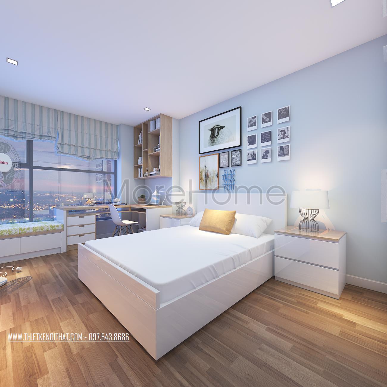 Cuối cùng là thiết kế nội thất không gian phòng ngủ sử dụng các tone màu vàng và xanh pastel làm điểm nhấn theo nét cá tính và sở thích của từng thành viên. Các vật liệu nhẹ như gỗ tự nhiên và kính cường lực được sử dụng để tránh cảm giác nặng nề và tăng độ thoáng cho không gian.