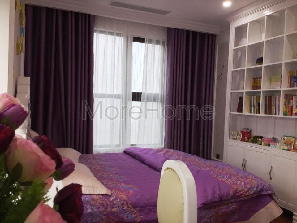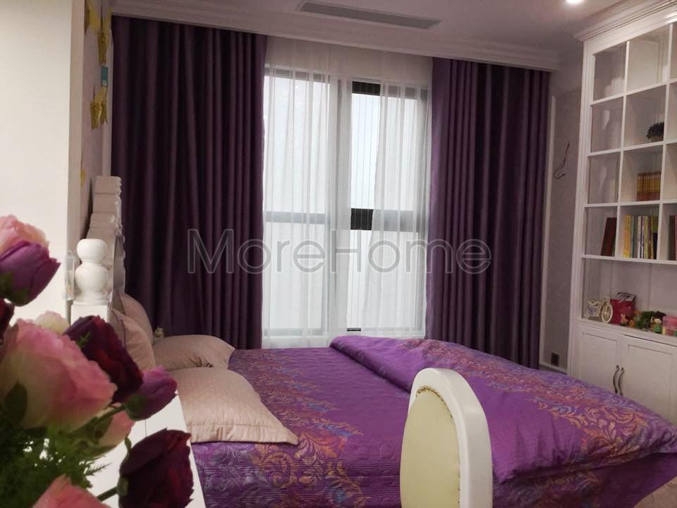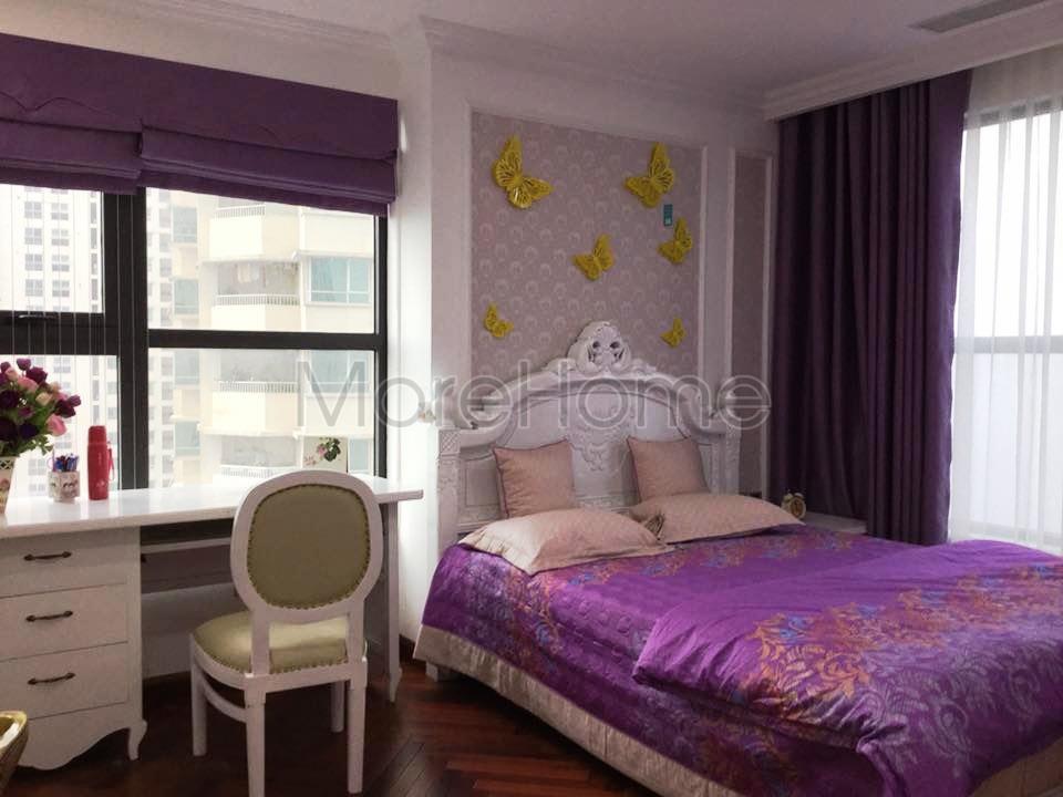 Không gian phòng ngủ tiếp theo sử dụng tone màu tím trầm làm điểm nhấn gợi cảm giác ấm cúng và thân thiện. Thiết kế sử dụng giấy dán tường với hoa văn nhẹ nhàng không quá phô trương nhưng phần nào tránh được sự nhàm chán và đơn điệu, từ đó giúp định hình cá tính cho căn nhà. Màu sắc sử dụng trong mỗi không gian được phối nhẹ nhàng theo sở thích của từng thành viên mang lại nét cá tính riêng. Với căn phòng ngủ cuối cùng, tone màu beige đậm sử dụng không nhấn nặng vào chi tiết mang đến cảm giác gần gũi và ấm áp.