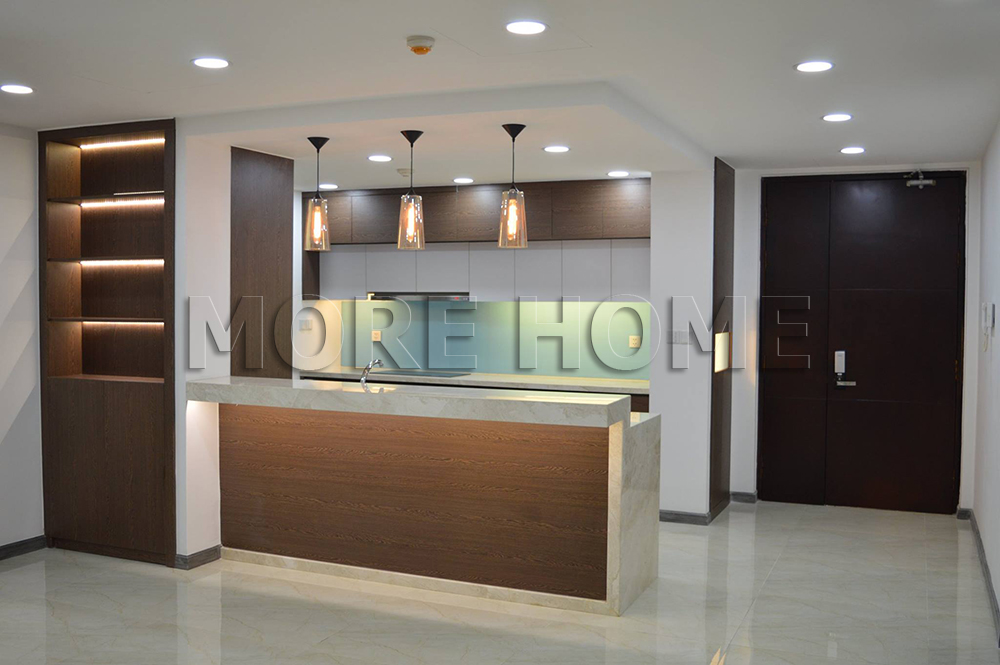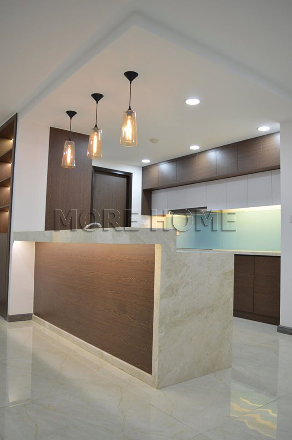Nếu bạn muốn sở hữu những nội thất độc đáo môt chút, bạn có thể nghĩ tớ những kiểu tô điểm cho không gian bếp bằng một chiếc đèn thả hình trụ như trên hình, hay một chiếc giá có những đường nét uốn lượn lạ mắt, điều này tuy đắt đỏ nhưng cũng vừa tầm với những căn hộ thi công đơn giản dù là thi công nội thất cao cấp hay giá rẻ, tuy nhiên vẫn phải đảm bảo sự tiện nghi và nét đẹp riêng. Nhìn chung căn phòng này công ty thi công nội thất tphcm (Morehome) đã sử dụng những thiết kế hiện đại và tói giản, đem đến sự hiện đại và nhẹ nhàng cho không gian.